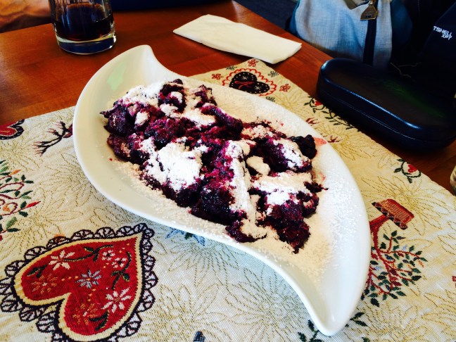 As you can see, it is a slightly different approach, mixing the sauce in with the pancake. This creates a very, very moist Kaiserschmarrn with bursts of fruit and juice. It was blackberry instead of plum, which gave it a more strong taste, and a lot of icing sugar ensured it was very sweet. The sugar had slightly crystalised with the heat, and formed delicate crunchy patches – which contrasted really well with the juicy-ness.